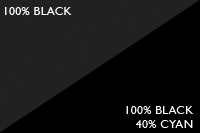 Черный цвет в модели CMYK может быть получен разными способами. Самый очевидный - это печать черной краской, состоящей на 100% из черного пигмента. Этот способ идеален для небольших объектов, таких как текст, тонкие линии. На крупных объектах заливки из 100% черной краски могут выглядеть несколько тусклыми. Чтобы получить более плотный черный цвет на таких заливках, рекомендуем добавить к 100% черной краски 40% голубой (C:40, M:0, Y:0, K:100).